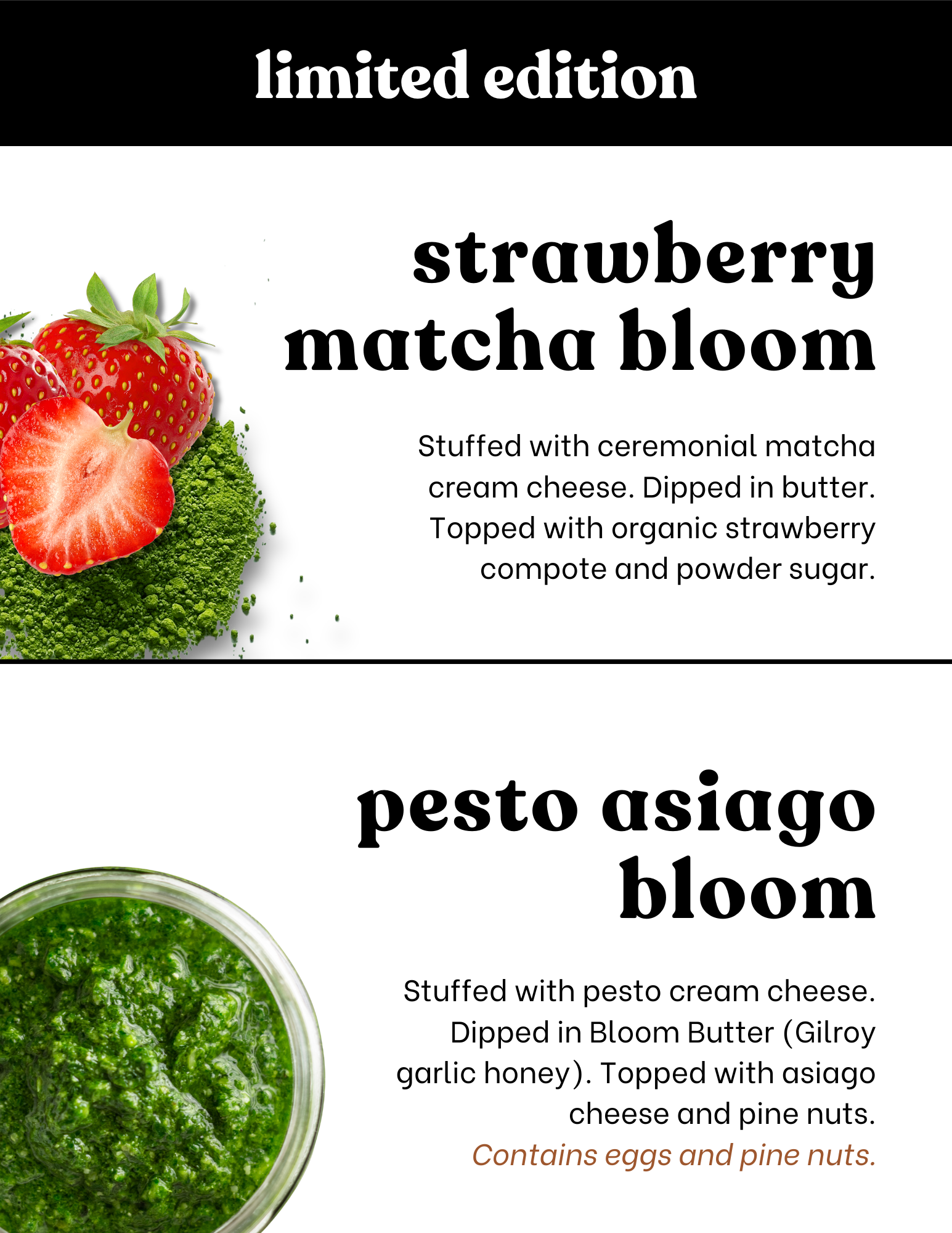 Cut, stuffed, baked twice. Enjoy by ripping each section apart. Bloom Butter = honey Gilroy garlic butter (contains eggs)